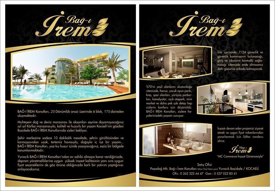 Yuvacik Paşadağı Mevkii’nde bulunan Bağ-ı İrem Konutları 20.500 m2 arazi üzerinde 6 blok 170 daireden oluşmaktadır. Deniz, orman, dağ ve şehir manzarasıyla seyrine doyamayacağınız, kaliteli ve huzurlu bir yaşam Kocaeli’nin gözdesi Yuvacık’ta sizleri bekliyor.